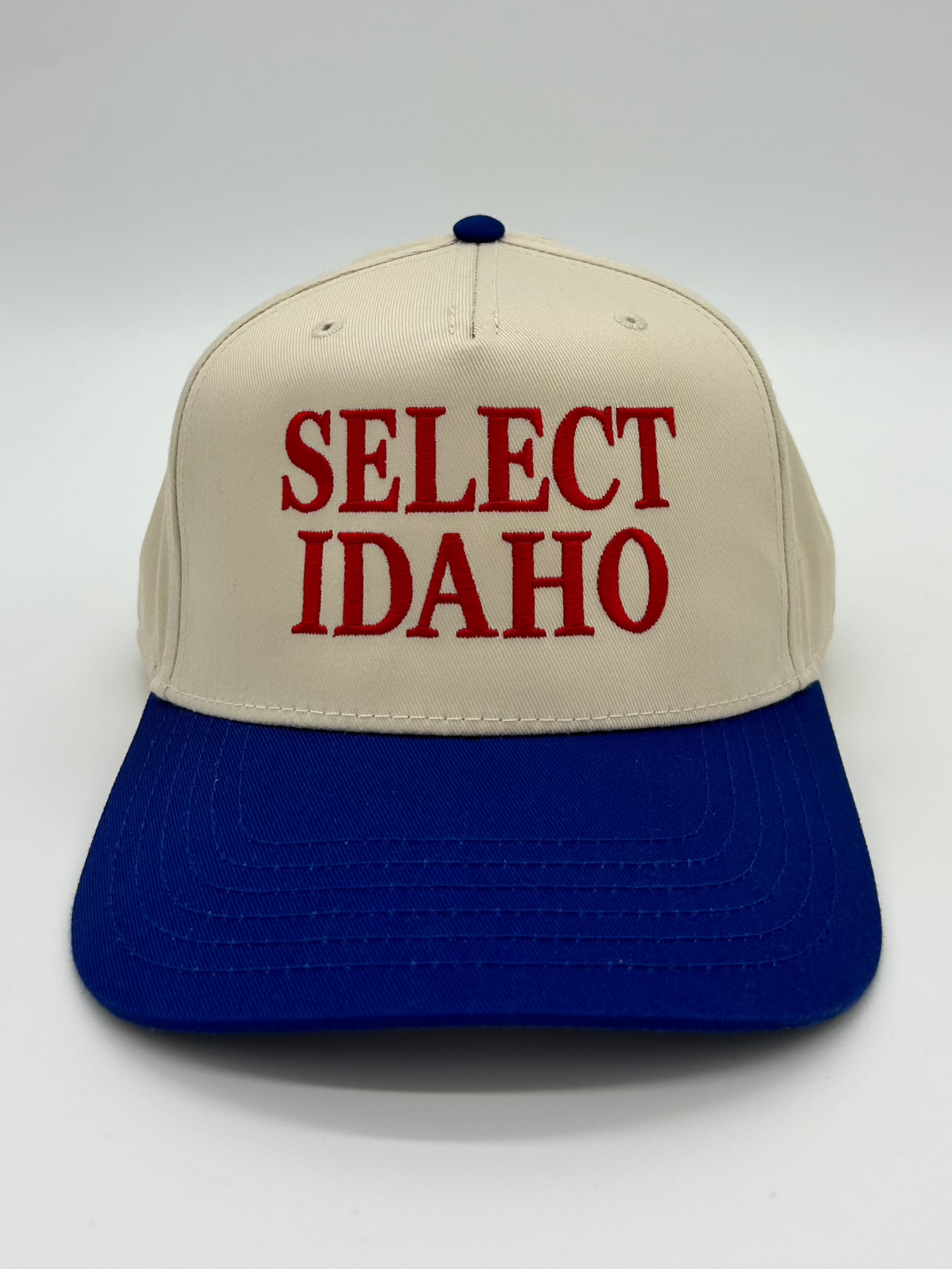 (Blue & Red) - 5 Panel Mid Profile Cap. Adjustable snapback with raised embroidery on the front and SELECT IDAHO logo on the back. Handcrafted by Illumnate Design locally in Boise, ID.