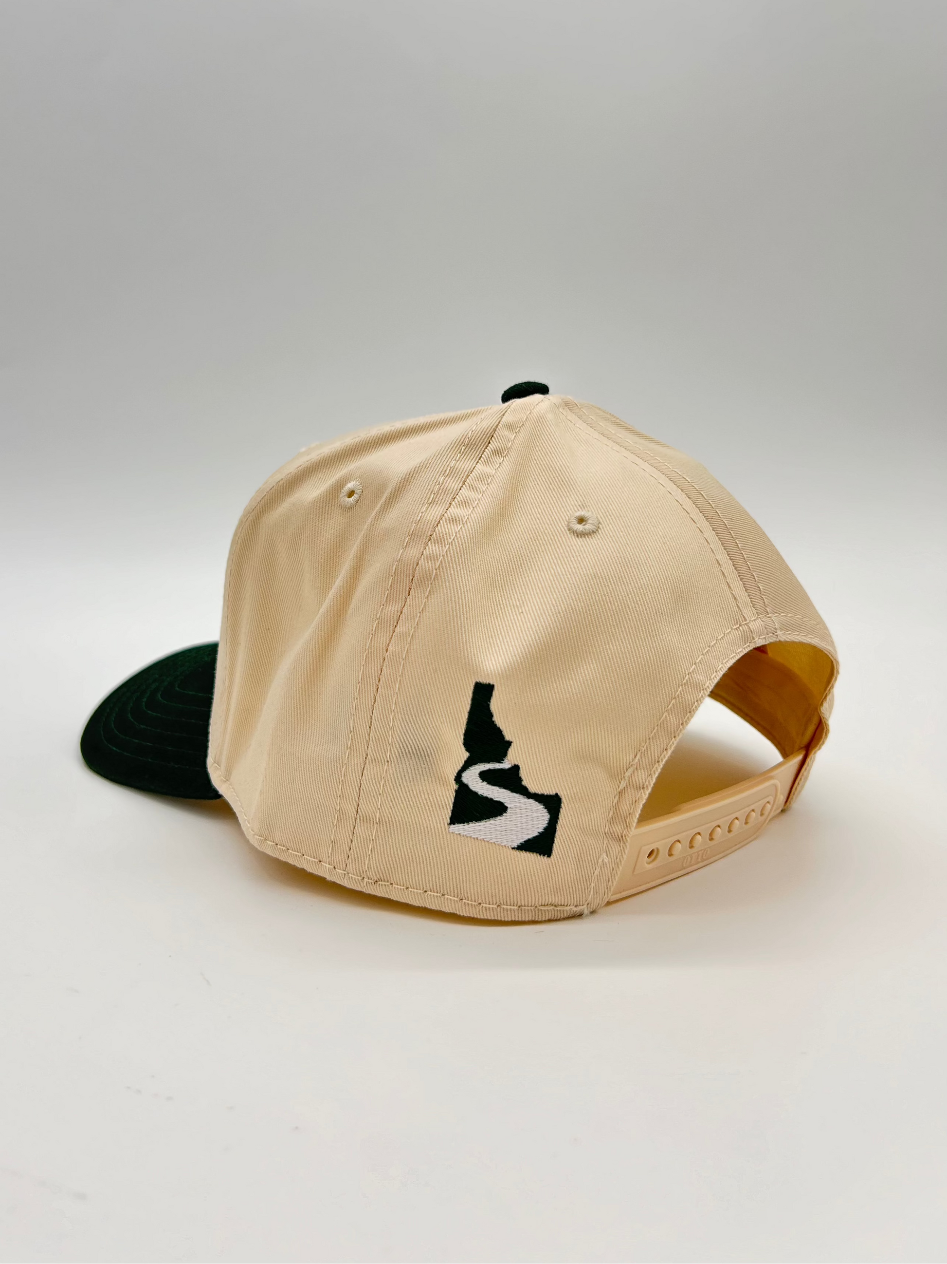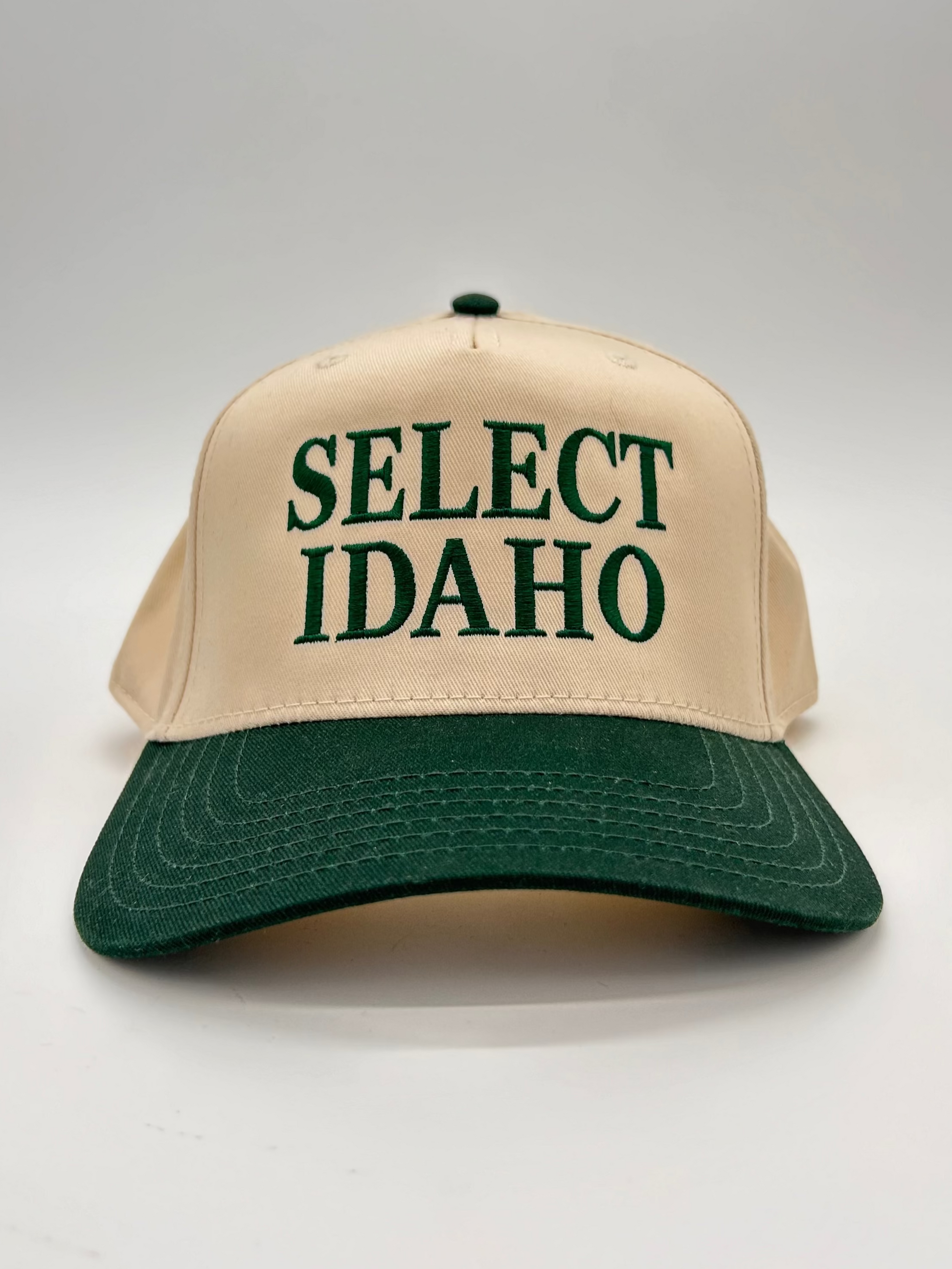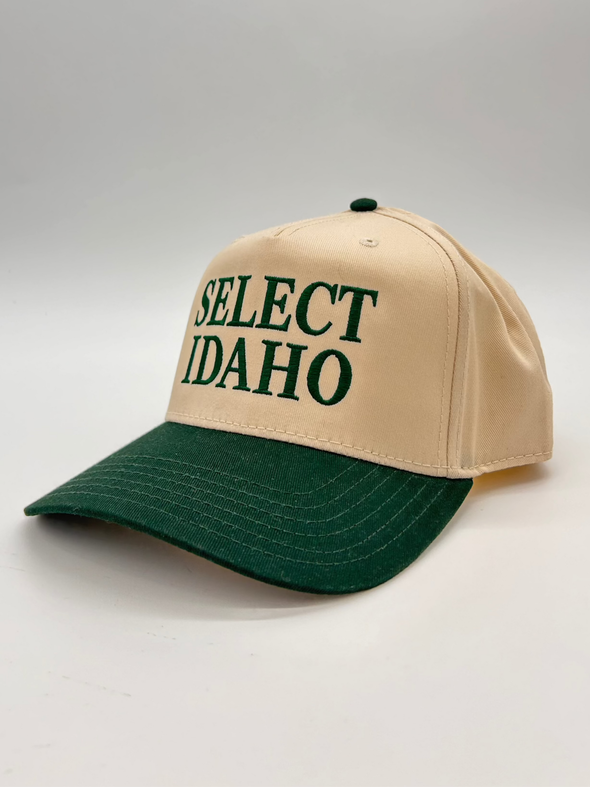 (Green) - 5 Panel Mid Profile Cap. Adjustable snapback with raised embroidery on the front and SELECT IDAHO logo on the back. Handcrafted by Illuminate Design locally in Boise, ID.