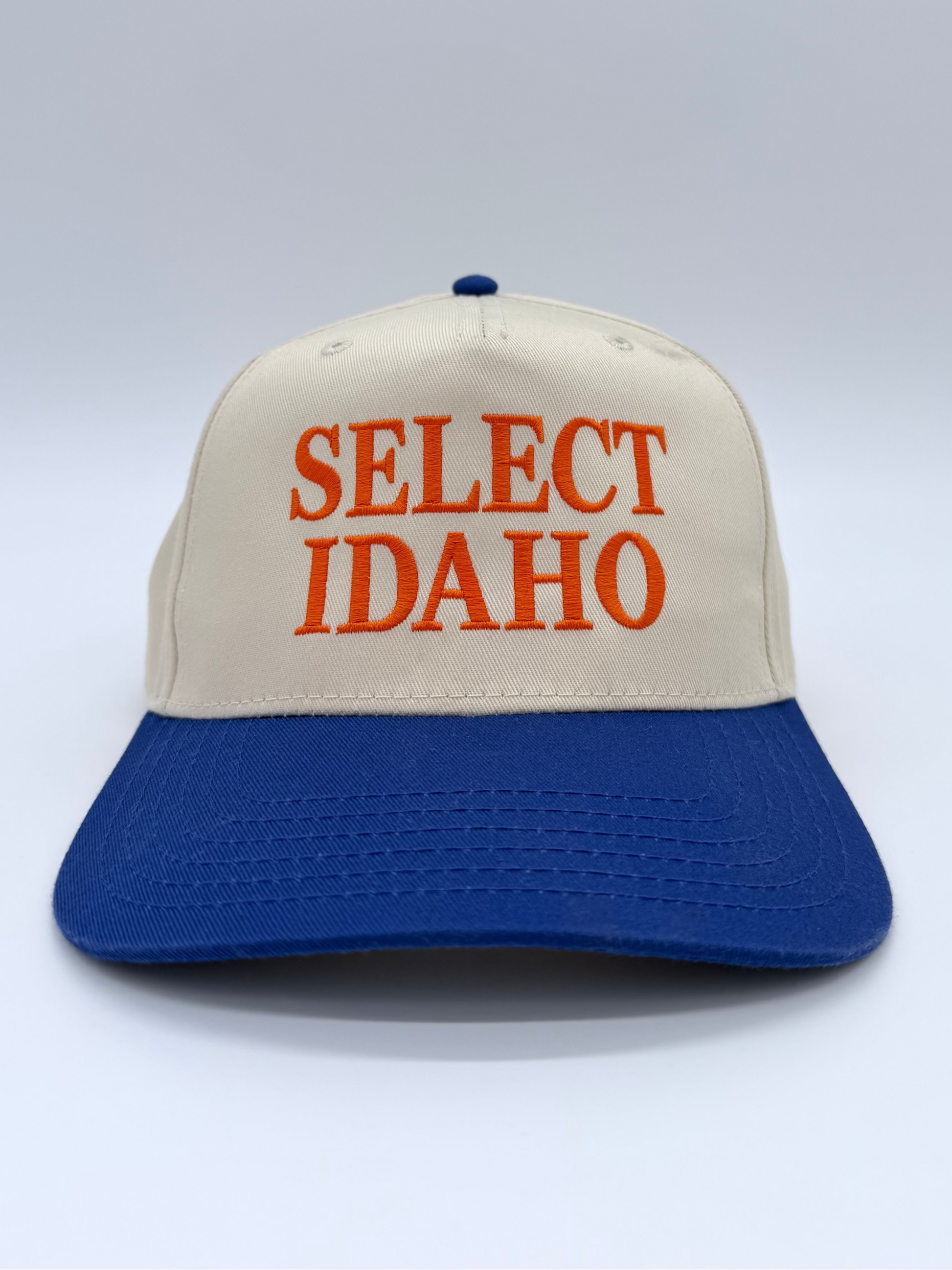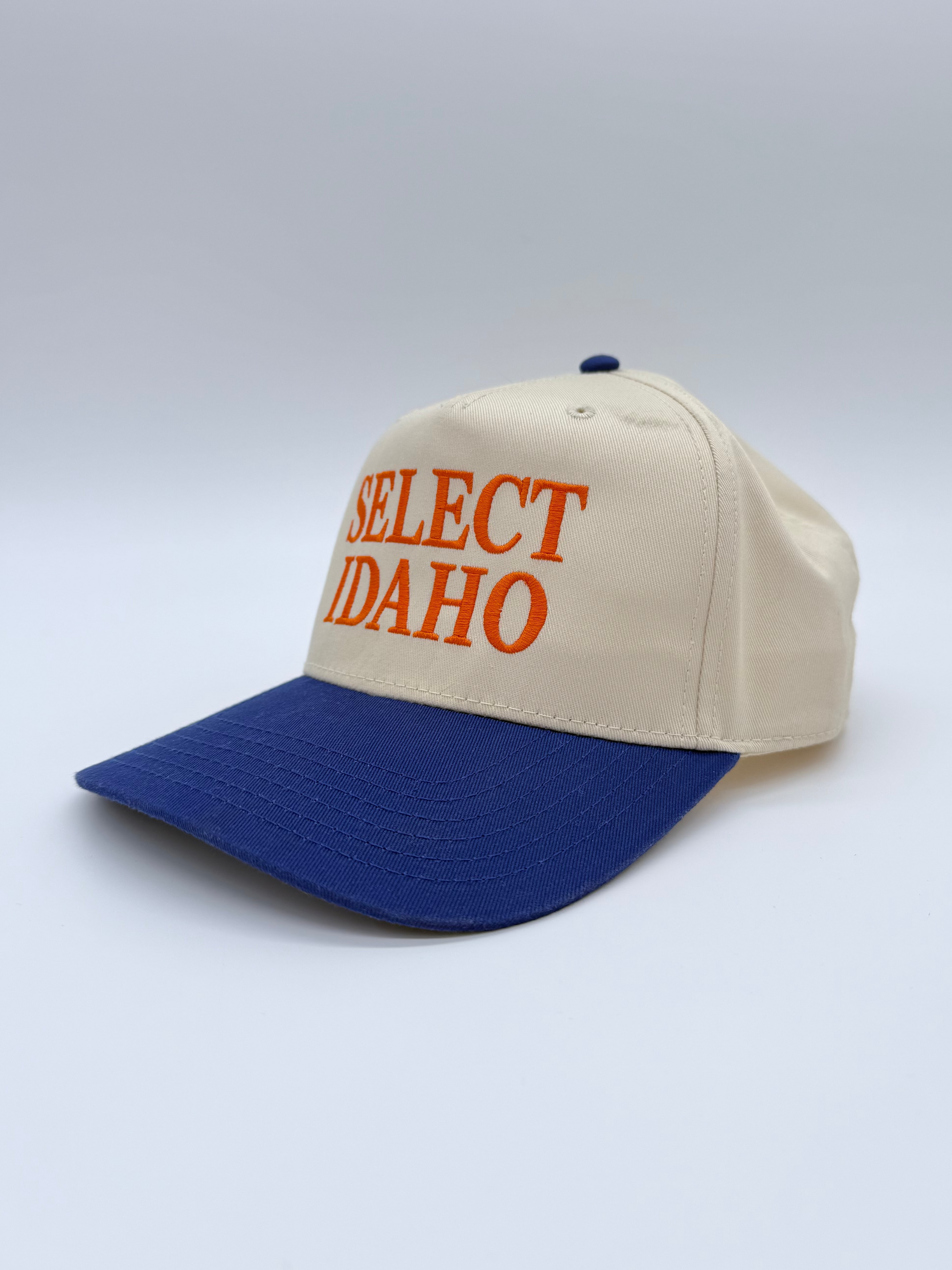 (Blue & Orange) - 5 Panel Mid Profile Cap. Adjustable snapback with raised embroidery on the front and SELECT IDAHO logo on the back. Handcrafted by Illuminate Design locally in Boise, ID.